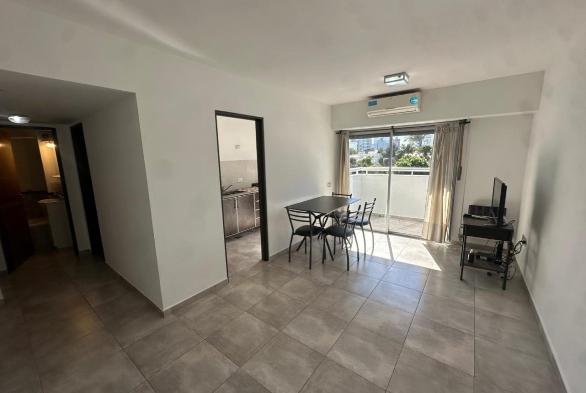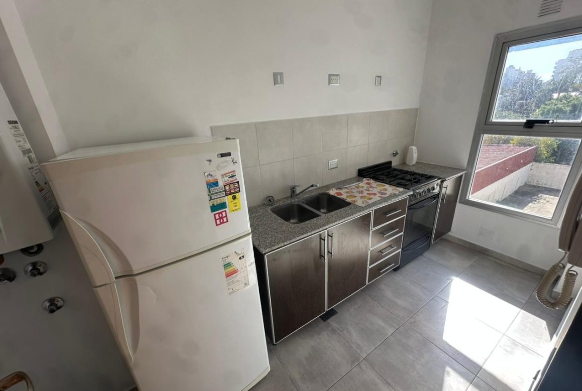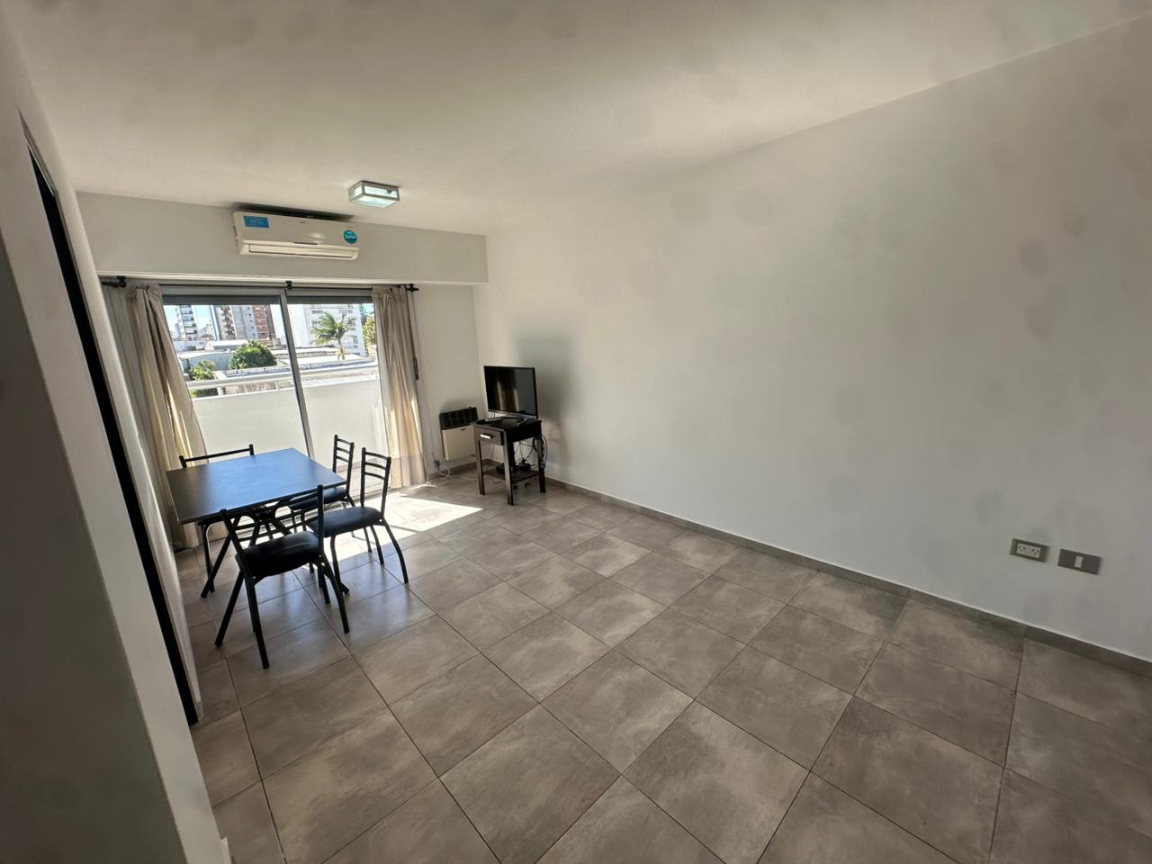Cuenta con un dormitorio con placard y cama sommier de dos plazas, además de un mueble y mesita para TV; living comedor con aire acondicionado, televisor Ken Brown de 32 pulgadas y luminarias en todos los ambientes; cocina separada equipada con heladera con freezer (no incluye platos ni cubiertos); baño completo con bañera. Mesa de melamina con cuatro sillas.